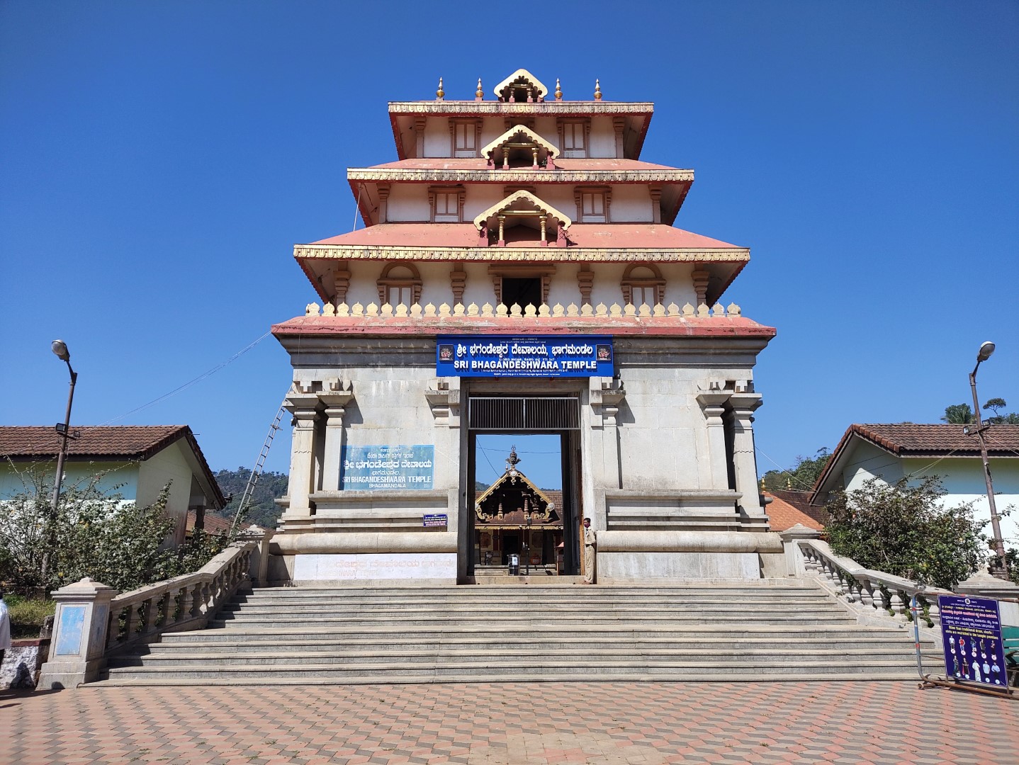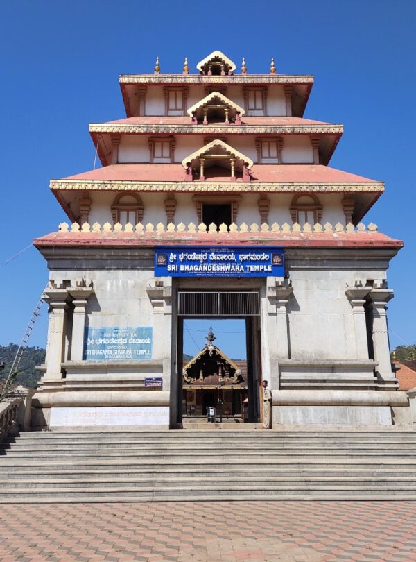 Bhagamandala is a sacred pilgrimage site located around 39 kilometers from Madikeri in the Kodagu district of Karnataka. It is known for the Triveni Sangama, the confluence of three rivers — the Kaveri, Kannike, and the mythical Sujyoti. At this holy spot stands the Bhagandeshwara Temple, dedicated to Lord Shiva and built in traditional Kerala-style architecture with tiered roofs. Bhagamandala is a significant site for rituals, especially for offering prayers to ancestors. Many pilgrims take a holy dip at the Sangama before heading to Talakaveri, the origin of the River Kaveri. Surrounded by forested hills and coffee plantations, the area offers both spiritual solace and natural beauty.